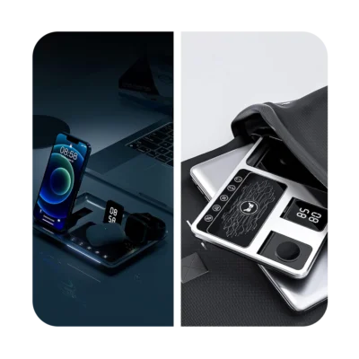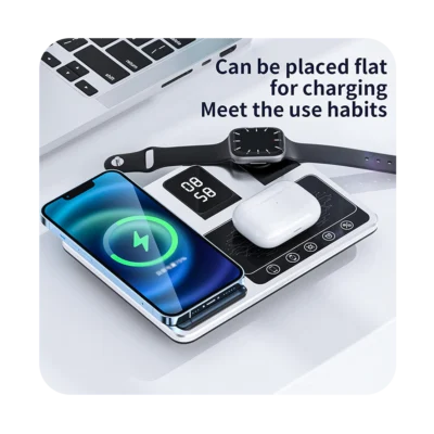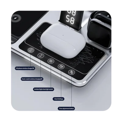 ساعت رومیزی و استند شارژ بیسیم چندمنظوره برای شارژ همزمان گوشی، اپل واچ و ایرپاد بوده و با انواع فناوری شارژ بیسیم دستگاه ها سازگار است.